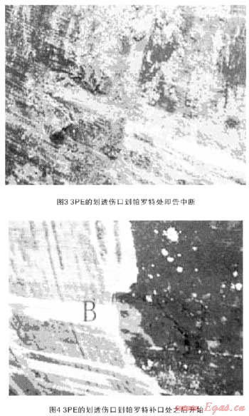 可以看到,管體3PE的劃透傷口到帕羅特補(bǔ)口處即告中斷,見圖3。也可看到,管體3PE的劃透傷口從帕羅特補(bǔ)口處之后開始,見圖4。