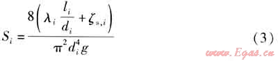 式(5)是體積流量與供水壓力的計(jì)算關(guān)系式,求解的關(guān)鍵是確定各管段的管長(zhǎng)、管道內(nèi)直徑、沿程阻力系數(shù)和局部阻力系數(shù)之和。