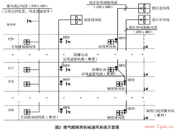 (1) 廚房的機械補風系統(tǒng)可設置為低區(qū)和高區(qū),低區(qū)從5層到16層,高區(qū)從17層到28層,低區(qū)和高區(qū)各負責12層。低區(qū)和高區(qū)的排油煙豎井(采用550×450成品風道)合用,低區(qū)和高區(qū)的事故排風豎井也是高、低區(qū)合用。