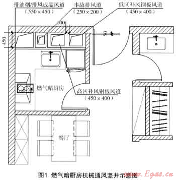 第二方案,燃氣暗廚房設置排油煙系統(tǒng)、事故排風系統(tǒng)、補風系統(tǒng):燃氣泄漏報警及排油煙/排風機出現(xiàn)故障時,聯(lián)動切斷燃氣管道供應的總閥門,所有通風設備均為防爆設備。采用了很多主動技術(shù)來加強通風,如圖1、圖2所示: