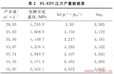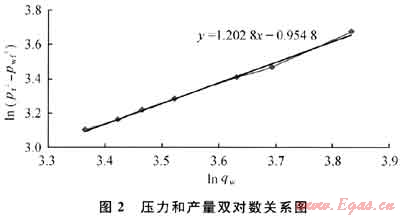 將測(cè)試數(shù)據(jù)在雙對(duì)數(shù)坐標(biāo)上以qw為橫坐標(biāo),pr2-pwf2為縱坐標(biāo)作圖,根據(jù)截距為J和斜率1/n就可以確定產(chǎn)能方程。對(duì)測(cè)試數(shù)據(jù)進(jìn)行回歸分析,確定J和n,結(jié)合煤層煤粉和砂的產(chǎn)出狀況,確定在不破壞煤層原始狀態(tài)下的最大產(chǎn)水量,進(jìn)而確定生產(chǎn)壓差。