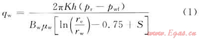 在排采初期,煤層中的水在儲(chǔ)層壓力(pr)與井底壓力(pwf)之差作用下進(jìn)入井中,此時(shí),整個(gè)煤儲(chǔ)層中單相流,考慮煤層氣井的泄流體積范罔內(nèi)為徑向流動(dòng),且水相滲流滿足達(dá)西定律,同時(shí)考慮表皮因子的影響,則第一個(gè)階段單相水的產(chǎn)量公式為: