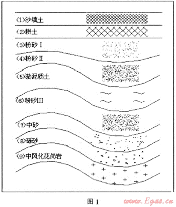 福建省沿海地區(qū)多是海相沉積地質(zhì),其中漳州九龍江平原地質(zhì)多屬于淤泥質(zhì)軟土地區(qū),從該建筑場(chǎng)地地質(zhì)勘探報(bào)告表明,場(chǎng)地為Ⅲ類軟土地基,主要含飽和淤泥和可液化砂層,土層分布如圖1所示[1]。從地質(zhì)勘探報(bào)告上看,軟土地質(zhì)是造成建筑物沉降最基礎(chǔ)性的原因。