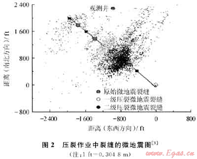 為了增加裂縫和氣層的接觸面積以提高氣井的初始產(chǎn)氣量和采收率,目前一般采用10~20級(jí)的壓裂以增加裂縫的連通。通過(guò)井場(chǎng)實(shí)時(shí)微地震來(lái)進(jìn)行監(jiān)控(圖2),可以確定井眼東西和南北方向的裂縫頂端的方位,并且隨著壓裂作業(yè)的進(jìn)行而跟蹤裂縫的形成過(guò)程。裂縫垂向的延伸具有特別重要的作用,作業(yè)者需要特別關(guān)注確保裂縫沒(méi)有延伸到頁(yè)巖層之外或者鄰近的水層中去,不然會(huì)使頁(yè)巖氣井的經(jīng)濟(jì)效益減少。