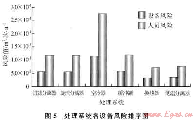 2) 注采氣站風險評估結果表明:壓縮機系統(tǒng)和處理系統(tǒng)風險遠遠大于管路系統(tǒng)風險,其中壓縮機組最大;處理系統(tǒng)設備中空冷器風險最大,其次是緩沖罐(壓縮機出口)、過濾分離器和旋流分離器(圖5);而管路系統(tǒng)中對帶壓的34條管線中,從壓縮機出口到緩沖罐出口的管線P2112~P2118風險最大,其中P2113最大,管路系統(tǒng)風險值大主要是由于壓力和溫度相對較高引起的。采用風險矩陣對各類設備或管路風險定級可知:壓縮機風險為高風險,而管路系統(tǒng)均為中低風險(圖6)。通過風險排序,明確了高風險單元,即可采用HAZOP法進行詳細風險分析。