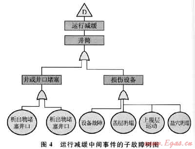 1) 建立故障樹,以地下儲氣設施失效作為頂事件,而泄漏和注采能力下降作為次級事件(如圖3所示),圖3中的A、B、C、D則分別表示泄漏到大氣、通過地層泄漏、運行中斷和運行減緩中間事件,并可進一步建立子故障樹,圖4為運行減緩中間事件的子故障樹。