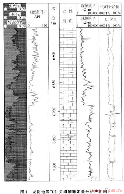 在四川盆地龍崗地區(qū)飛仙關(guān)組鉆進(jìn)中,應(yīng)用碳酸鹽巖定量分析技術(shù)對(duì)龍崗地區(qū)3口井進(jìn)行了采樣分析。從其中一口井的分析可見(圖1),在6750~6890m儲(chǔ)層段,酸不溶物、石灰質(zhì)含量高,與上部泥灰?guī)r的自然伽馬高值、雙側(cè)向低值對(duì)應(yīng)較好;在6890~6992m儲(chǔ)層段,白云質(zhì)含量出現(xiàn)至高值,與鮞灘白云巖的自然伽馬低值、雙側(cè)向高值顯示吻合較好睜…,為判斷飛仙關(guān)組鮞灘儲(chǔ)層提供了可靠依據(jù)。但酸不溶物含量偏高,與鮞灘儲(chǔ)層物性相關(guān)性稍差。