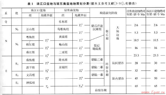 據(jù)鉆井及地震資料揭示,南海北部陸緣盆地新生代沉積地層自下而上可劃分為:前古近系基底,古近系古新統(tǒng)、始新統(tǒng)及漸新統(tǒng),新近系中新統(tǒng)、上新統(tǒng),第四系。盆地構(gòu)造演化階段經(jīng)歷了古近紀(jì)裂陷階段(具體可劃分為3個(gè)裂陷幕),新近紀(jì)-早、中中新世裂陷后坳陷階段及晚中新世第四紀(jì)裂陷后洋盆沉降期3個(gè)階段(表1)。