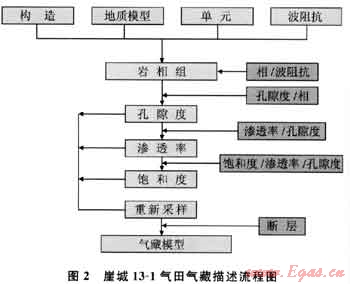 這次氣藏描述通過(guò)使用多步驟、復(fù)合地質(zhì)統(tǒng)計(jì)模擬技術(shù),構(gòu)建了多個(gè)具有同等概率分布的巖相組、孔隙度和滲透率模型,圖2是崖城13-1氣田氣藏描述流程。巖相組模式是這個(gè)流程的基本模型,它是以巖心的巖相描述資料為基礎(chǔ),用三維地震波阻抗體進(jìn)行外推,應(yīng)用分類(lèi)變量條件序貫指示模擬方法(SISIMPDFP)來(lái)構(gòu)建的,模擬的實(shí)現(xiàn)與實(shí)際的鉆井資料和地質(zhì)模型保持一致。在這個(gè)模型的基礎(chǔ)上,選擇巖相組模型和特定巖相組的孔隙度統(tǒng)計(jì)結(jié)果,使用序貫高斯模擬方法(SGSIM)估算孔隙度值。滲透率的分布則根據(jù)不同的巖相組、孔隙度以及用井資料確立的孔-滲關(guān)系,利用序貫高斯協(xié)模擬(SGCOSIM)來(lái)確定。