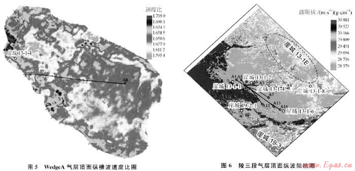 理論計(jì)算、正演模擬和實(shí)際道集分析均表明崖城13-1氣田陵三段氣層具有Ⅳ類(lèi)AV0特征,那么三亞組和陵三段氣層周邊的勘探目標(biāo)是否也屬Ⅳ類(lèi)AVO特征呢?三亞組的WedgeA砂體在2000年之前只有崖城13-1-4井鉆遇,鉆遇的地層厚度為111.3m,但氣層厚度只有6m,且物性較差,滲透率只有14mD,之前的地質(zhì)研究成果認(rèn)為該砂體的開(kāi)發(fā)潛力不大。但是該砂體在地震資料上反射特征清楚,通過(guò)對(duì)比追蹤、AV0分析和疊前AV0反演認(rèn)為該砂體具有與陵三段氣層相同的Ⅳ類(lèi)AVO特征(圖4),從反演得到的WedgeA頂面縱橫波速度比分布圖(圖5)可以看出崖城13-1-4井鉆遇了WedgeA砂體的邊部,相對(duì)整個(gè)砂體來(lái)說(shuō)崖城13-1-4井位置物性較差,而該砂體東部物性變好、含氣性特征更明顯、厚度也變大,通過(guò)崖城13-1-4井層速度預(yù)測(cè)砂體A8井處氣層厚度在50m以上,基于上述的地震預(yù)測(cè)結(jié)果決定鉆探A8井。于2000年在崖城13-1-4井東邊鉆探了A8井,在該砂體鉆遇氣層厚度達(dá)65.2m,滲透率高達(dá)1600mD、日產(chǎn)氣150×104m3,是目前該氣田產(chǎn)量最高的井之一,從而證實(shí)了鉆前的地震預(yù)測(cè)結(jié)果。