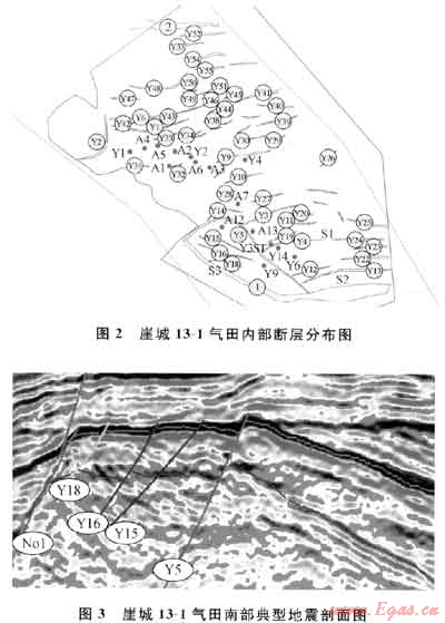 氣田內(nèi)部發(fā)育著兩組斷裂(圖2):一組為北西向和近南北向的斷裂,另一組NEE向的斷裂將崖城13-1氣田分成南、北兩塊,其中南塊又可分為S1、S2及S3塊;氣田內(nèi)部斷層的斷距較小,一般都小于70m(圖3),未完全錯(cuò)斷陵三段近200m厚的儲(chǔ)集層,似乎對油氣不起封堵作用。