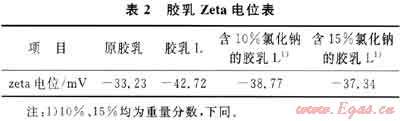 從表2可以看出,耐鹽膠乳和含穩(wěn)定劑的膠乳L的zeta電位分別為-33.23mV和-42.72mV,由此可見穩(wěn)定劑的加入,有利于提高膠乳的穩(wěn)定性。含10%的氯化鈉和含15%氯化鈉的膠乳L的zeta電位分別為-38.77mV和-37.34mV,由于NaCl的加入,使得鈉離子向擴(kuò)散層擴(kuò)散,降低了乳液的zeta電位,即降低了膠乳的穩(wěn)定性,即使這樣,由于穩(wěn)定劑的存在,使得含鹽膠乳的zeta電位仍大于不含穩(wěn)定劑的原膠乳的zeta電位,即含鹽膠乳L仍比原膠乳穩(wěn)定。