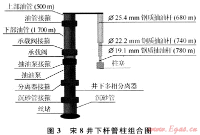 該井井下配套裝置采用前述Ф44mm防腐防氣整筒式金屬柱塞泵、組合式井下高效多相分離器、承載閥裝置。井下桿管柱結(jié)構(gòu)經(jīng)過(guò)優(yōu)化設(shè)計(jì),在現(xiàn)有抽油機(jī)條件下,采用Ф25.4mm×820m+Ф22.2mm×800m+Ф19.1mm×700m的D級(jí)抽油桿方案(圖3)。但由于機(jī)抽井少,桿柱調(diào)節(jié)困難,仍采用原井桿柱(即泵掛2200m),且由于配套抽油桿短節(jié)缺失,上部Ф25.4mm抽油桿與光桿之間采用臨時(shí)加工的普通平扣短節(jié)代替。