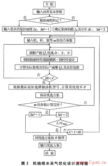 根據(jù)排水采氣井的地質(zhì)資料、生產(chǎn)數(shù)據(jù)、測(cè)井資料等數(shù)據(jù),在目前較為成熟的理論研究成果的基礎(chǔ)上,通過(guò)進(jìn)一步對(duì)機(jī)抽井的理論研究工作,研制出了“機(jī)抽排水采氣系統(tǒng)優(yōu)化設(shè)計(jì)軟件”。該軟件分為機(jī)抽井校核、機(jī)抽井設(shè)計(jì)、轉(zhuǎn)抽井設(shè)計(jì)、機(jī)抽井管理、機(jī)抽井診斷、實(shí)測(cè)系統(tǒng)效率計(jì)算、軟件幫助7大子系統(tǒng)[4~5]。應(yīng)用該軟件,在供排協(xié)調(diào)條件下對(duì)機(jī)一桿一泵系統(tǒng)進(jìn)行優(yōu)化設(shè)計(jì)與參數(shù)、設(shè)備等的優(yōu)選,其優(yōu)化設(shè)計(jì)流程如圖2所示。