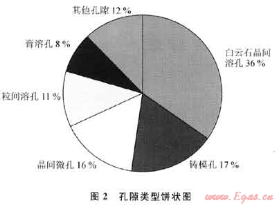 根據(jù)巖心鑄體薄片、電鏡掃描分析,Asmari組孔隙類(lèi)型豐富多樣,以次生孔隙為主;原生孔隙極少,在成巖作用過(guò)程中幾乎破壞殆盡??紫吨饕獮橥砥谌芪g作用形成的白云石晶間溶孔、粒屑鑄??住⒘ig及粒內(nèi)溶孔、膏溶孔或膏??住F渲?,白云石晶間溶孔,生屑、砂屑等碳酸鹽巖粒屑被溶蝕或選擇性溶蝕形成的鑄???、粒內(nèi)或粒間溶孔以及膏溶孔等,分別占各類(lèi)孔隙的36%;白云石、少量方解石的晶間微孔占16%;粒間孔、粒內(nèi)孔、生屑體腔孔、殼壁孔等原生孔隙以及其他類(lèi)型的孔隙僅占12%(圖2)。