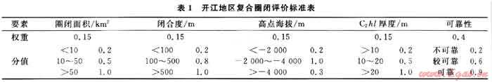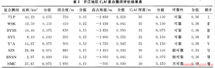 C2hl及其上、下巖層的組合是四川盆地多套生、儲蓋組合中較好的一套組合,經(jīng)過多年的勘探也證實C2hl具有豐富的天然氣資源。結(jié)合已發(fā)現(xiàn)C2hl氣藏特征對已識別C2hl復(fù)合圈閉面積進行劃分,圈閉面積小于10km2的權(quán)值取0.2,圈閉面積大于50km2的取權(quán)值1.0,圈閉面積介于10~50km2的取權(quán)值0.5,圈閉面積評價系數(shù)權(quán)重為O.15(表1)。