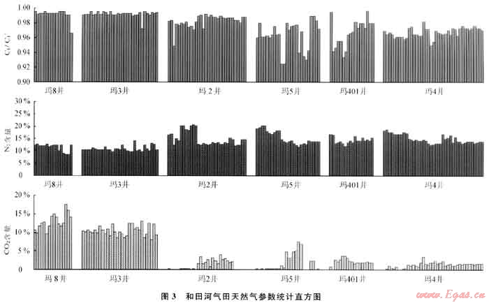和田河氣田是疊合盆地多期構(gòu)造運動與多期成藏演化的典型,引起很多學(xué)者關(guān)注[6~7],對其天然氣特征已有詳細的研究[1~2],總體上具有高CH4、高N2的特征,屬高含非烴的干氣,東西部存在差異[2~8]。油氣成藏特征及其演化在不同區(qū)段也有差異[9~10],天然氣的成因也揭示不同井區(qū)氣源不同[2~11],表明該區(qū)天然氣在分布特征與成因機理上都有很大的不同。