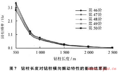 取固有頻率階數(shù)為第46~50時的固有頻率值比較,鉆柱長度對振動的影響計算結(jié)果如圖7所示。鉆柱長度增加,其橫向振動固有頻率明顯降低。鉆柱長度的變化對直井整體鉆柱橫向振動特性影響非常明顯。根據(jù)計算結(jié)果,把固有頻率轉(zhuǎn)換成轉(zhuǎn)速,整體鉆柱長度為500m時,其對應(yīng)轉(zhuǎn)速在轉(zhuǎn)盤轉(zhuǎn)速60~70r/min的固有頻率有3階;鉆柱長度為800m時,有5階;鉆柱長度為1000m時,有7階;鉆柱長度為1500m時,有13階;鉆柱長度為2000m時,達(dá)16階;鉆柱長度為2500m時,共有20階之多。