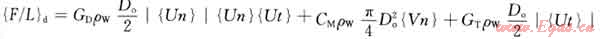 式中{F/L}d表示由于液體動力效應(yīng)引起的單位長度上的載荷;CD表示法向阻力系數(shù);ρw表示外部液體的密度;Do表示管柱實際外徑;{Un}表示法向相對速度矢量;CM表示慣性系數(shù);{Vn}表示法向加速度矢量;CT表示切向阻力系數(shù);{Ut}表示切向上相對速度矢量。