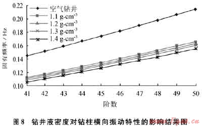 由于鉆井液的存在,鉆柱在進行軸向運動的時候,受到鉆井液的黏滯作用。根據(jù)鉆井液的流變特性,其密度越高,黏度越大,對鉆柱軸向運動的阻礙作用越明顯??梢?,鉆井液會對鉆柱縱向振動的固有頻率產(chǎn)生很大影響,改變縱向振動的臨界轉(zhuǎn)速,這種影響必須引起足夠的重視。