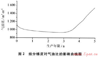 由于重力分離的作用,凝析氣藏在縱向上存在組分梯度,即隨深度的增加,凝析氣藏的組分會(huì)發(fā)生變化,流體變重。而某些凝析氣藏的組分梯度很明顯,如雅克拉和大澇壩凝析氣藏。而在對氣井進(jìn)行射孔時(shí),為了減小邊、底水的影響,一般選擇對儲(chǔ)層的上部進(jìn)行射孔,這就造成氣井剛開始生產(chǎn)的凝析氣主要為深度較淺的流體,這些凝析氣相對于更深的凝析氣來說組分較輕,因此剛開始生產(chǎn)時(shí)的氣油比較高,而隨著開采的繼續(xù),將采出更多的深層較重的凝析氣,這就造成生產(chǎn)氣油比的下降。
