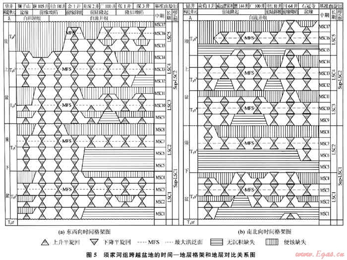 1) 依據(jù)層序界面和最大洪泛面發(fā)育特征,可將四川盆地上三疊統(tǒng)須家河組劃分為分別代表“須下盆”成盆期和“須上盆”成盆期的兩個與構造層序相當?shù)某L期旋回層序、5個分別對應于須二段-須六段的長期旋回層序(LSC1~LSC5)和17個中期(MSC1~MSC17)旋回層序。
