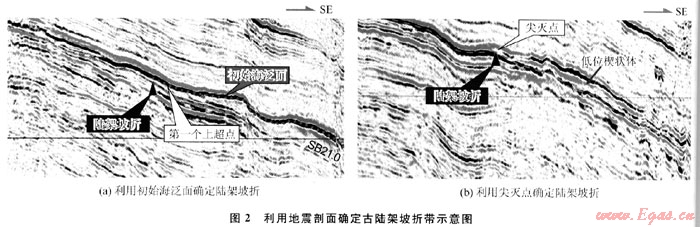 陸架坡折帶地形較為復(fù)雜,所以,確定陸架坡折點和范圍的方法非常重要。陸架坡折點為陸架最外緣坡度開始明顯變化的點,它位于陸架與陸坡之間過渡帶的向陸點。古陸架坡折點的識別則更加困難,主要依賴于地震資料,是在確定了層序邊界的基礎(chǔ)上進(jìn)行的。可分為以下2種類型加以識別。
