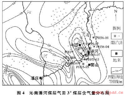 垂向上,下部15#煤層的含氣量明顯高于上部的3#煤層;平面上,3#煤層含氣量介于8~24m3/t,如圖4所示,以竇山東北、潘河口、馬凹為中心分別形成3個煤層氣富集區(qū),含氣量高達24m3/t,在潘河先導(dǎo)性試驗區(qū)內(nèi)主要以潘河口為中心形成高含氣量區(qū),向外圍逐漸降低,在試驗區(qū)的西北及西南方向先降低,后又逐步增高。