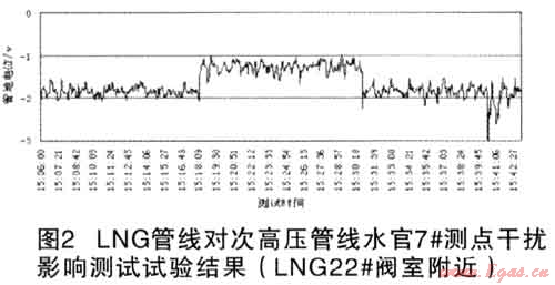 由于部分路段次高壓天然氣管道與上游LNG管道和成品油管道并行(采用外加電流陰極保護),為了判斷LNG管線對次高壓管線的影響,技術(shù)人員進行了現(xiàn)場測試,主要包括:LNG管線的保護電位、次高壓管線保護電位,并在LNG管線平湖門站陰極保護站恒電位儀開10分鐘一停10分鐘一開10分鐘共30分鐘的時間段內(nèi),用記錄儀檢測了次高壓管線的陰極保護電位波動情況。通過檢測發(fā)現(xiàn),LNG管線和次高壓管線閉路電位都不穩(wěn),波動較大。