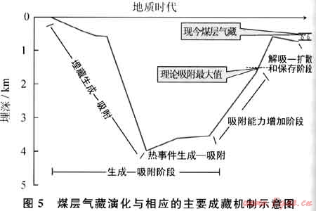 煤層氣成藏演化伴隨著煤層的沉積、埋藏變質(zhì)和抬升的演化過程。我國除變質(zhì)程度較低的含煤盆地外,絕大多數(shù)含煤盆地都經(jīng)歷了沉降和回返抬升演化階段,有的盆地甚至經(jīng)歷了多次的旋回。煤層的埋藏-抬升決定了煤層氣的成藏演化經(jīng)歷生成和吸附、吸附能力增加和解吸、擴散、保存階段(圖5)。保存條件是控制現(xiàn)今煤層氣富集的關(guān)鍵,現(xiàn)今煤層氣藏的形成取決于構(gòu)造控藏關(guān)鍵時刻。這一關(guān)鍵時刻不等同于常規(guī)天然氣成藏的關(guān)鍵時刻,它是指地質(zhì)歷史時期煤層生烴終止后具有最小埋藏深度的時間。