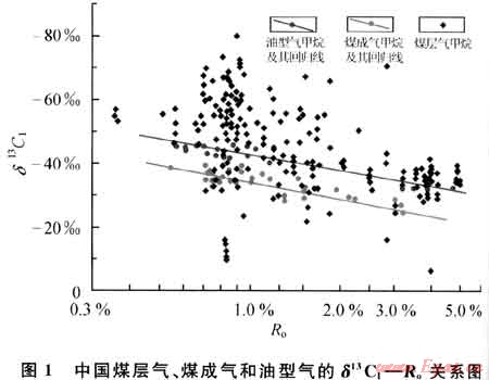 天然氣的甲烷碳同位素值主要受控于原始母質(zhì)類型和后期改造程度,煤層氣與常規(guī)天然氣碳同位素值的差異主要是由于煤層氣具有獨特的后期改造特征。常規(guī)天然氣甲烷碳同位素值主要受到母質(zhì)和烴源巖熱演化程度(Ro)的影響,相同成熟度條件的烴源巖,煤成氣比油型氣的δ13C1要重,同一母質(zhì)類型的天然氣δ13C1隨著成熟度的增加而變重(圖1);常規(guī)天然氣的后期改造,除典型生物氣外,我國已發(fā)現(xiàn)的大中型煤成氣氣藏受到生物降解的影響較小,對甲烷碳同位素值的影響不大。而煤層氣,由于氣源來自煤巖本身,甲烷碳同位素值除了受烴源巖成熟度影響外,后期的解吸作用、生物作用和水動力作用是主要的影響因素。煤層氣為吸附氣,后期吸附解吸過程中,13CH4比12CH4難解吸,從而發(fā)生同位素的分餾效應(yīng),造成同位素值的變化[32];目前工業(yè)開采利用的煤層氣藏一般埋深淺于2000m,生物降解作用使得烴源巖成熟度相近的煤層氣較常規(guī)煤成氣的甲烷碳同位素值偏輕[28,33~34];煤層氣受水動力條件影響也較大,其作用機制為甲烷通過水溶作用而改變同位素的組成[35]。
