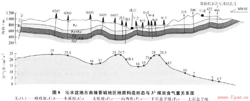 5) 在成藏機制上,煤層氣的聚集受水勢和壓力的控制,往往具有向斜富集的特征;常規(guī)天然氣聚集受氣勢的控制,往往具有背斜或高部位富集的特征。