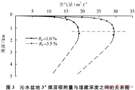 因此,影響煤層吸附能力的主要因素是煤階、溫度和壓力。在正常地溫梯度下,埋深1500m以淺的煤層吸附能力主要受壓力控制,在這個深度范圍煤層吸附能力達到最大值之后隨著埋深加大含氣量具有降低的趨勢(圖3)[39]。因此,煤層含氣量主要受到溫度壓力場的控制。