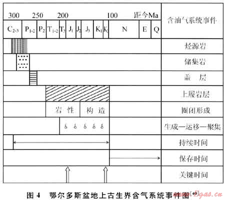 常規(guī)天然氣的成藏演化過程一般經(jīng)歷3個階段:生成階段、運移和聚集階段、保存和破壞階段。氣藏演化不一定經(jīng)歷晚期抬升過程,烴源巖、儲層和蓋層等靜態(tài)要素和天然氣生成、運移、圈閉形成和成藏等過程的動態(tài)地質(zhì)作用的最佳時空匹配是其成藏的關(guān)鍵。如鄂爾多斯盆地上古生界天然氣成藏要素及地質(zhì)作用的最佳匹配時間(關(guān)鍵時刻)是早侏羅世和晚白堊世[40](圖4)。