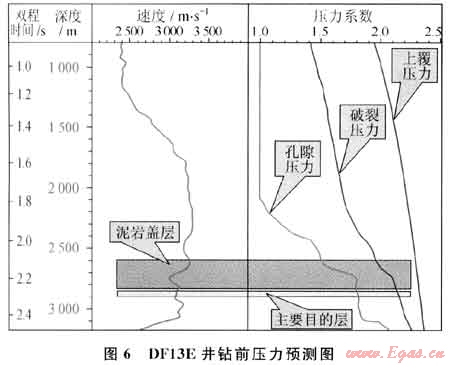 對東方1-1三維地震資料進行精細研究[18~19],在東方氣田西翼發(fā)現(xiàn)黃流組一段大型三角洲體系,落實一群巖性圈閉,經(jīng)過反復研究和論證,鉆探DF13E井(圖5),該井鉆探目的為探索黃流組一段上部砂體含油氣性和儲量規(guī)模;獲取東方1-1構造西塊中層的儲層物性、油氣層流體性質及產(chǎn)能資料。該井鉆遇的蓋層與DF11C井和DF11D井的明顯不同,該井位于東方底辟構造西側、底辟背斜之外,鉆探結果在黃流組一段上部揭示了一套厚達220m的海侵-高位體系域淺海泥巖蓋層,這套直接蓋層不僅厚度大,而且泥巖純,塑性強(可鉆性差),受壓實程度較高,分布范圍較廣,具有超壓(壓力系數(shù)為1.5~1.8)(圖6),表現(xiàn)出良好的高壓封蓋性能,為異常高壓氣藏的形成提供了重要保障。