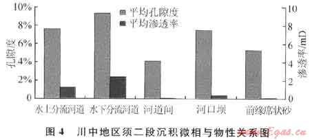 物性分析結(jié)果也顯示不同沉積微相的砂巖孔隙度和滲透率差異明顯(圖4),河道微相和砂壩相砂體與溢流砂坪相砂體相比,其平均滲透率級差可為2~3倍。利用300個巖樣滲透率分析的結(jié)果,結(jié)合前人對須二段物性分析的成果,繪制須二段滲透率平面分布圖,發(fā)現(xiàn)中高孔滲帶(孔隙度大于8%、滲透率大于0.1mD)主要沿主河道或次水道的流向分布,其中滲透率介于1~10mD的儲層面積約占整個砂體平面分布12%,滲透率為1~0.1mD的儲層面積約占整個砂體平面分布65%,滲透率為0.1~0.01mD的儲層面積約占整個砂體平面分布15%,滲透率小于0.01mD的儲層面積約占整個砂體平面分布8%,以上說明須二段儲層的平面非均質(zhì)性較強。