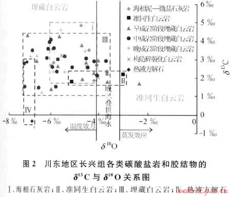 3) 由碳、氧同位素組成隨成巖強(qiáng)度加大而負(fù)偏值加大的變化趨勢(shì),可確定早成巖階段埋藏白云巖化發(fā)生在低溫流體中,而中、晚成巖階段白云巖化和構(gòu)造隆升期白云巖碎裂化和重結(jié)晶作用發(fā)生在溫度逐漸升高的成巖流體中[19]。