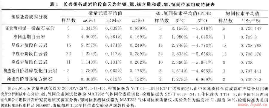 對(duì)各成巖階段白云巖的鐵、錳、鍶微量元素和碳、氧、鍶穩(wěn)定同位素分析結(jié)果由表1所示,地球化學(xué)特征研究分析如下。