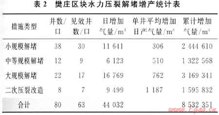 近兩年期間,在樊莊區(qū)塊共實施各類水力壓裂改造井80口,其中小規(guī)模解堵井38口,中等規(guī)模解堵井12口,大規(guī)模解堵井22口,二次重新壓裂井8口,日平均增加產(chǎn)氣量44032m3,單井日平均產(chǎn)氣量提高550m3以上,措施有效率達(dá)到78%(表2)。