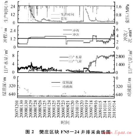 FN5-24井于2006年11月12日完鉆,完鉆井深783m。2007年4月14日壓裂3#煤層,壓裂井段721.6~727.5m,厚度5.9m,共注入活性水壓裂液551m3,石英砂45m3。2007年12月9日投產(chǎn),排采134d解吸見氣,最高日產(chǎn)氣量達(dá)到693m3,產(chǎn)氣高峰時日產(chǎn)水3.5m3,維持30d后日產(chǎn)氣量迅速下降至211m3,水量0.9m3。解吸初期套壓高,出現(xiàn)頻繁俜抽導(dǎo)致井底壓力波動,低產(chǎn)判斷為由于井底壓力反復(fù)波動導(dǎo)致地層氣鎖,導(dǎo)致套壓、產(chǎn)氣量迅速下降(圖2)。2010年4月6日進(jìn)行中等規(guī)模壓裂解堵,措施后183d,產(chǎn)氣量增加至2683m3,截至目前已穩(wěn)產(chǎn)24d,累計增產(chǎn)氣40×104m3。