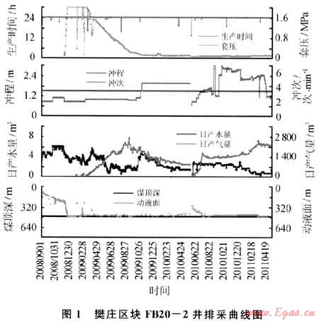 煤層氣井通過下套管固井、射孔壓裂完井后投入生產(chǎn),流體入井直接通道為射孔孔眼、井筒附近煤層壓裂破碎帶,由于煤層氣生產(chǎn)為低壓生產(chǎn),與常規(guī)油氣相比,該區(qū)域更容易被粉煤灰、泥漿、頂?shù)装迥鄮r、作業(yè)帶來入井內(nèi)的外來物質(zhì)等填充堵塞,即近井地帶污染堵塞,堵塞后煤層氣產(chǎn)量會快速遞減。用水力壓裂的方法可以解除近井地帶堵塞,而水力壓裂具有施工規(guī)模大,成本高,實施時間長,見效周期較長等局限性。針對該類問題,2011年以來在樊莊區(qū)塊開展了運用高能電脈沖技術(shù)解除近井地帶污染增產(chǎn)試驗。其基本原理是運用高壓放電技術(shù)作用煤層氣井內(nèi)液體,使其產(chǎn)生強大的沖擊波,在近井地帶產(chǎn)生的壓力脈沖將井筒附近的地層污染解開[6]。該措施具有作業(yè)周期短、成本相對低等優(yōu)勢,但也具有脈沖壓力波及范圍小、對選井條件判別要求高等局限性。