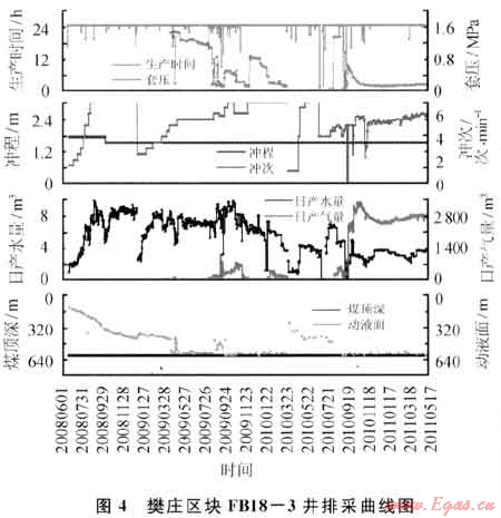 FB18-3井于2007年5月12日完鉆,完鉆井深650m。2008年6月6日壓裂3#煤層,壓裂井段587.9~592.5m,厚度4.6m,共注入清潔壓裂液246m3,石英砂30m3。2008年6月21日投產(chǎn),排采301d解吸見氣,最高日產(chǎn)氣量達(dá)到1226m3,產(chǎn)氣高峰時日產(chǎn)水16.2m3,維持30 d后產(chǎn)氣量迅速下降至87m3,水量11.5m3。判斷為首次壓裂效果差,導(dǎo)致見氣后套壓迅速下降,降壓范圍難以擴展(圖4)。2010年3月27日進(jìn)行二次壓裂,措施后168d,產(chǎn)量增加至2632m3,目前已穩(wěn)產(chǎn)238d,累計增產(chǎn)氣59×104m3。