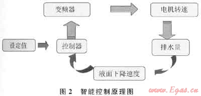智能控制系統(tǒng)由地面部分和井下部分組成。通過采集井下壓力計(jì)或地面流量計(jì)信號,根據(jù)煤層氣單井排采規(guī)律,地面人工預(yù)先設(shè)定井底流壓變化值,由智能控制系統(tǒng)自動閉環(huán)控制排采系統(tǒng)的工作參數(shù)(電機(jī)轉(zhuǎn)速或頻率),實(shí)現(xiàn)了井底流壓的智能控制。其控制原理如圖2所示。
