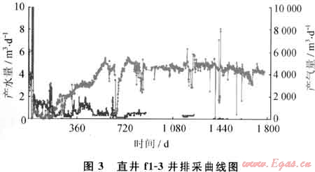 含氣性差異是產(chǎn)量相差較大的主要原因,在構(gòu)造溢散邊界(斷層、“陷落柱”)附近、地下水補(bǔ)給邊界附近,其煤層氣富集條件較差,開(kāi)發(fā)效果較差。低產(chǎn)井區(qū)位于構(gòu)造溢散邊界,也是地下水補(bǔ)給邊界附近,煤層氣含量低,其富集較差。樊莊區(qū)塊東部井區(qū)煤層氣井處于大氣降水補(bǔ)給邊界,含氣量一般介于5~17m3/t,含氣飽和度低于80%,直井平均產(chǎn)量不足500m3/d。圖1為樊莊區(qū)塊東部1口井的排采曲線(xiàn),該井排采2年多累計(jì)產(chǎn)氣量?jī)H25×104m3,最高日產(chǎn)氣量還達(dá)不到1000m3。該井區(qū)多數(shù)井生產(chǎn)情況與這口井相似,樊莊區(qū)塊東部井區(qū)單井產(chǎn)量普遍較低的主要原因是含氣量、含氣飽和度低,因此開(kāi)發(fā)效果較西部差。