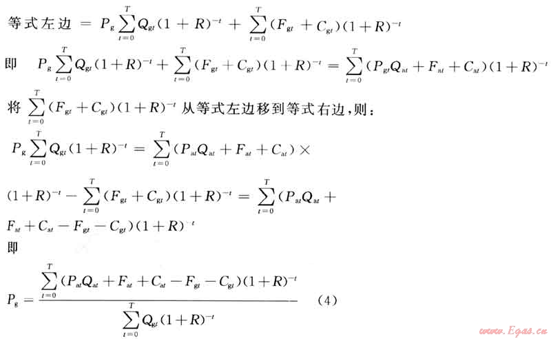 設(shè)T為使用裝置的經(jīng)濟(jì)壽命期年限;t為使用裝置經(jīng)濟(jì)壽命期內(nèi)的某1年,從開始年(0年)到第T年;Pg為替代前提下天然氣長期使用經(jīng)濟(jì)價值(它是用計(jì)算期開始年初現(xiàn)值度量的計(jì)算期內(nèi)的平均值,常數(shù));Qgt為達(dá)到相同使用效果情況下t年需要消耗的天然氣量;Fgt為達(dá)到相同使用效果情況下建設(shè)使用天然氣的裝置t年需要投入的固定資產(chǎn)投資;Cgt為達(dá)到相同使用效果情況下使用天然氣裝置t年需要發(fā)生的除折舊和天然氣費(fèi)用以外的其他完全成本(其中還包括營業(yè)費(fèi)用、財(cái)務(wù)費(fèi)和管理費(fèi));R為企業(yè)內(nèi)部收益率;Pat為t年等價替代物價格;Qat為達(dá)到相同使用效果情況下t年需要消耗的替代物數(shù)量;Fat為達(dá)到相同使用效果情況下建設(shè)使用替代物的裝置t年需要投入的固定資產(chǎn)投資;Cat為達(dá)到相同使用效果情況下使用替代物的裝置t年需要發(fā)生的除折舊和替代物費(fèi)用以外的其他完全成本(其中還包括營業(yè)費(fèi)用、財(cái)務(wù)費(fèi)和管理費(fèi))。