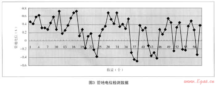 對(duì)整體管道的自然電位測(cè)試和原犧牲陽極保護(hù)系統(tǒng)進(jìn)行測(cè)試,大部分管道處在自然腐蝕電位狀態(tài)(-0.45v,Cu/CuS04參比電極),所測(cè)的60處管地電位在-0.49V~-0.72V之間波動(dòng)(見圖3),其中正值占77%,最負(fù)值-0.49V,達(dá)不到管道陰極保護(hù)電位(即管/地界面極化電位)要求的-0.85V,即管道運(yùn)行沒有處于陰極保護(hù)狀態(tài)。