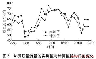 熱源質(zhì)量流量的實(shí)測(cè)值與計(jì)算值隨時(shí)間的變化見(jiàn)圖3。由圖3可知,除9:00和17:00偏差較大外,其余時(shí)刻相對(duì)誤差均在±10%以?xún)?nèi),全天質(zhì)量流量的計(jì)算值與實(shí)測(cè)值的平均相對(duì)誤差為-4.1%。由于9:00與17:00為上、下班時(shí)間,管網(wǎng)流量波動(dòng)較大,系統(tǒng)處于非穩(wěn)態(tài),因此計(jì)算值與實(shí)測(cè)值偏差較大。