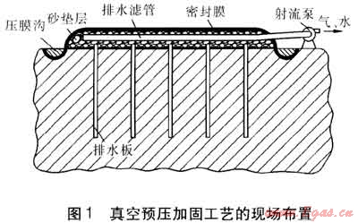 真空預壓加固是在需要加固的軟土地基表面先敷設砂墊層,然后豎直插設塑料排水板(作為豎向排水體),在砂墊層中橫向敷設排水濾管(透水管)。再用密封膜(聚乙烯、聚氯乙烯薄膜)進行覆蓋封膜四周開挖壓膜溝,將密封膜邊緣埋入壓膜溝起到密封作用,并采用射流泵對膜下進行抽氣(水),射流泵與排水濾管連接。在抽氣時,膜下逐步形成負壓,使土體內部與砂墊層、排水板間形成壓差。在壓差作用下,土體中的孔隙水沿排水板流向砂墊層,并由射流泵通過排水濾管排出,從而使土體固結[1]。