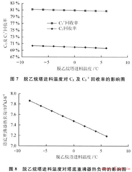 脫乙烷塔的進(jìn)料溫度對(duì)C3及C3+回收率和塔底重沸器熱負(fù)荷的影響如圖7、8所示。從圖7、8可以看出,隨著進(jìn)料溫度增加,C3及C3+回收率下降,塔底重沸器的熱負(fù)荷也隨之降低。這是因?yàn)檫M(jìn)料溫度增加,帶入了更多的熱量,從而使再沸器熱負(fù)荷減少。因脫乙烷塔塔頂沒(méi)有冷凝器,在進(jìn)料帶入更多熱量后,脫乙烷塔塔頂溫度升高,部分C3及C3+被帶走,導(dǎo)致C3及C3+回收率下降。