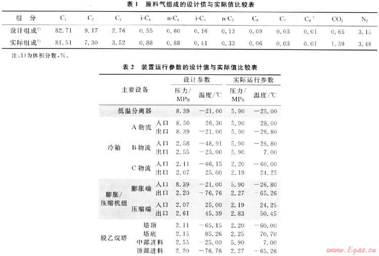 而實(shí)際生產(chǎn)中原料天然氣氣量增加為40×104m3/d,天然氣進(jìn)裝置的壓力約為6.00MPa,溫度約為25.O0℃,外輸干氣壓力約為2.80MPa,液化氣產(chǎn)量為29.0t/d,輕油產(chǎn)量為6.6t/d,外輸氣烴露點(diǎn)為-56.O0℃,外輸氣中C3組成為0.0113%(體積分?jǐn)?shù))。進(jìn)裝置的天然氣的組成及裝置運(yùn)行參數(shù)的設(shè)計(jì)值與實(shí)際值比較表分別見(jiàn)表1、2。